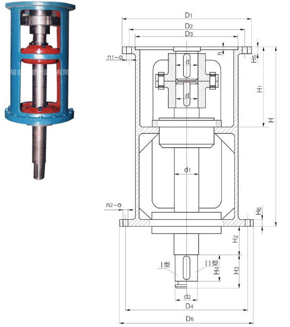 | 機架型號 | 減速機 | D1 | D2 | D3 | n1-φ | D4 | D5 | n2-φ | d | d1 | d2 | h | H | H1 | H2 | H3 | H4 | H5 | H6 |